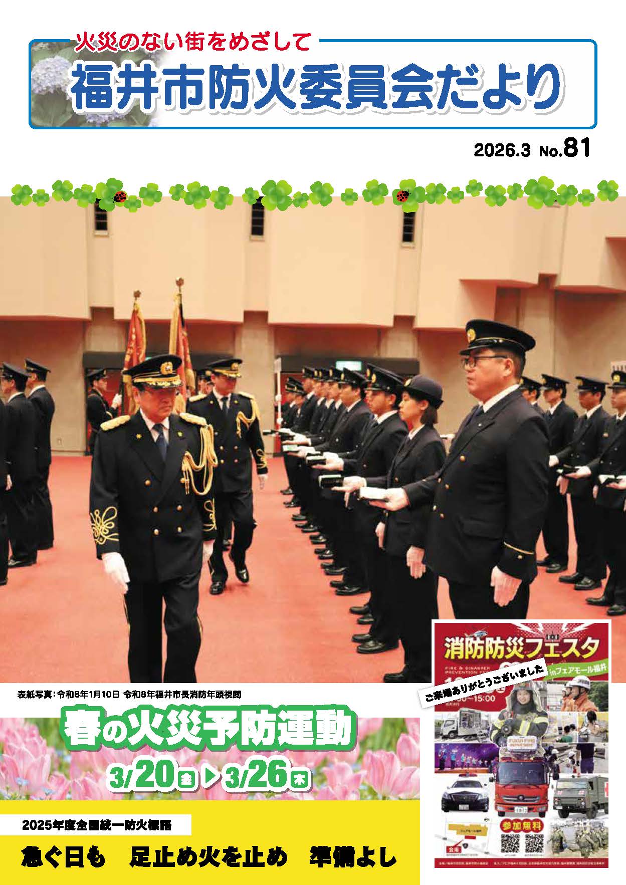 広報誌「福井市防火委員会だより」 最新号 「福井市防火委員会だよりNo.80」 (2025年11月 発行) – 目次 – 令和7年中の火災件数 「感震ブレーカー」を設置しましょう 「映像通報119」を運用しています! 「マイナ救急」が10月1日から開始されます! 防火ポスター入賞作品 第65回福井市自衛消防隊消防操法競技大会 消防団員募集 歳末消防特別警戒を実施 女性防火クラブ募集 住宅用火災警報器の維持管理について 補助金について バックナンバー 広報誌「福井市防火委員会だよりNo.79」 広報誌「福井市防火委員会だよりNo.78」 広報誌「福井市防火委員会だよりNo.77」 広報誌「福井市防火委員会だよりNo.76」 広報誌「福井市防火委員会だよりNo.75」 広報誌「福井市防火委員会だよりNo.74」 広報誌「福井市防火委員会だよりNo.73」 広報誌「福井市防火委員会だよりNo.72」 広報誌「福井市防火委員会だよりNo.71」