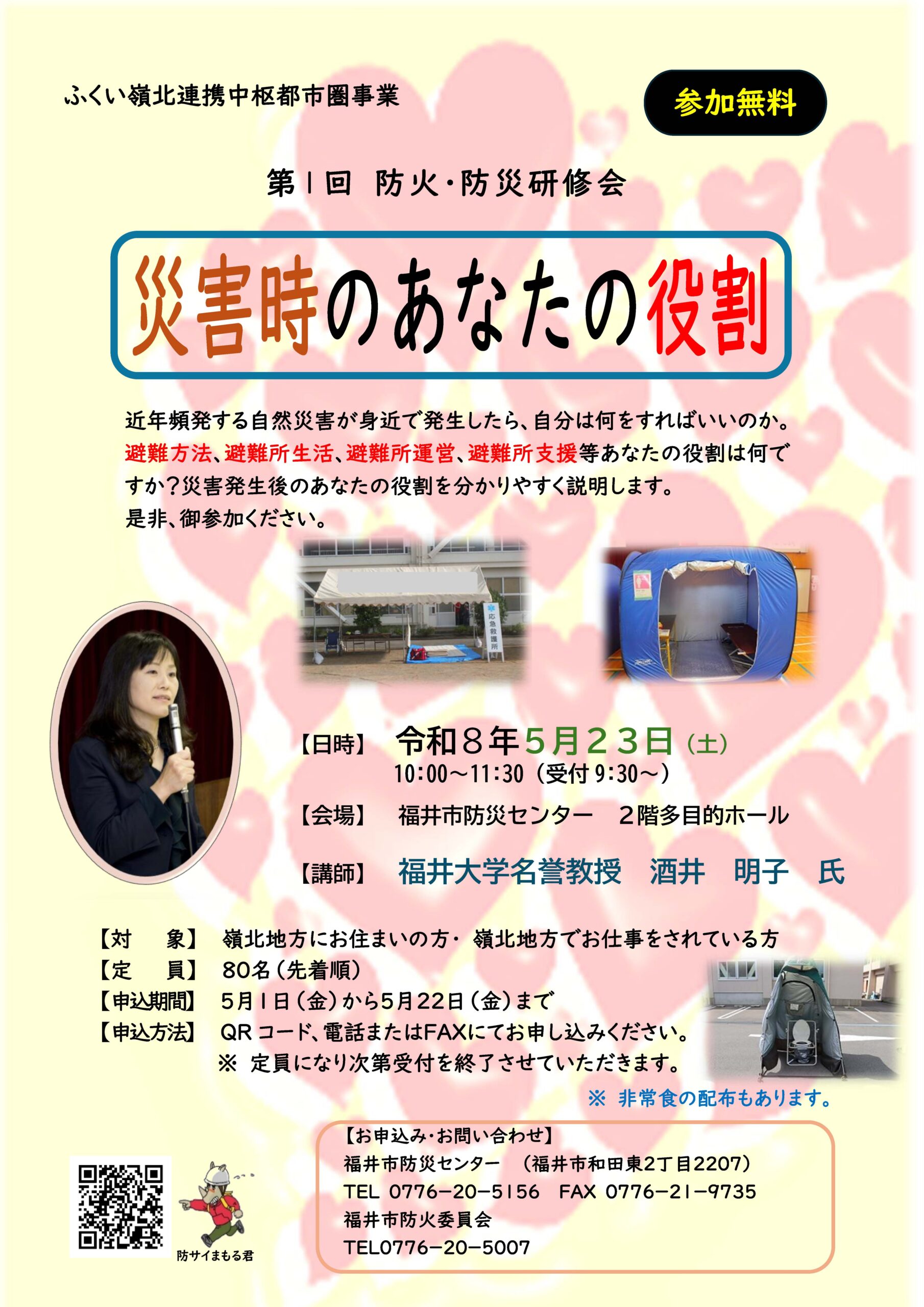 福井市防火委員会では、福井市消防局と共催し、市民の防火・防災意識の高揚を図るため、例年共催して研修会を開催しており、今年度は「災害時のあなたの役割」と題した講演を開催いたします。皆様のご参加をお待ちしています。